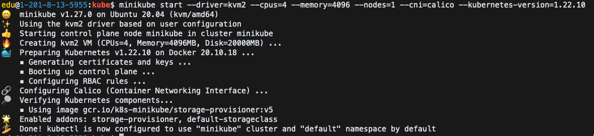 minikube start --driver=kvm2 --cpus=4 --memory=4096 --nodes=1 --cni=calico --kubernetes-version=1.22.10