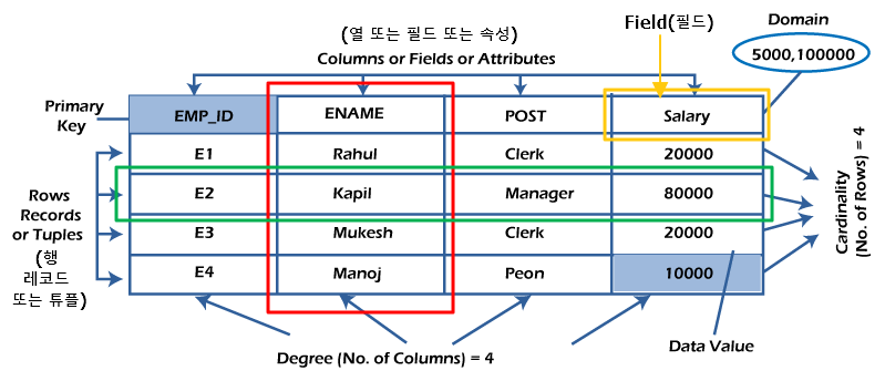 - 쿼리 언어: SQL(Structured Query Language)을 사용하여 데이터를 검색, 수정 및 관리합니다.