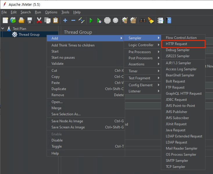 Test Plan 안에 Thread Group을 추가하고 원하는 스레드 수, 루프 수 등을 설정합니다. - Sampler 추가
