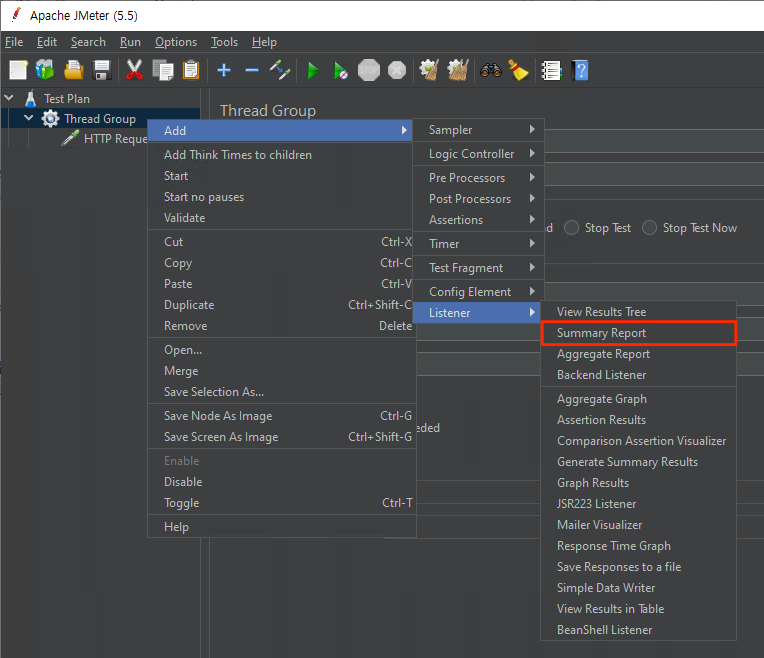 HTTP Request, JDBC Request 등의 Sampler를 추가하여 실제 테스트할 요청을 정의합니다. - 리스너 추가