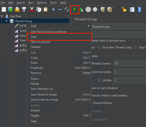 테스트 계획이 작성되면, "Start" 버튼을 클릭하여 테스트를 실행할 수 있습니다. JMeter는 각각의 스레드를 시작하고 지정된 요청을 수행합니다. 테스트가 완료되면 결과를 확인하고 원하는 경우 보고서를 생성할 수 있습니다.