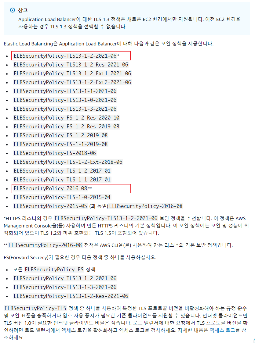 참고: ALB의 보안 정책 변경은 신중히 진행되어야 합니다. 적절한 보안 수준과 요구 사항을 고려하여 보안 정책을 선택하고 변경하는 것이 중요합니다.