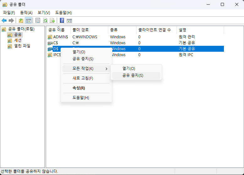 - fsmgmt.msc 명령어로 공유 폴더 중지