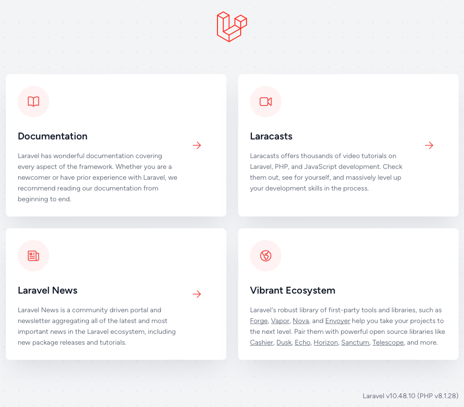 - 웹 브라우저에서 http://localhost을 열어 Laravel 애플리케이션이 제대로 동작하는지 확인합니다. Laravel의 기본 페이지가 보이면 성공입니다.
