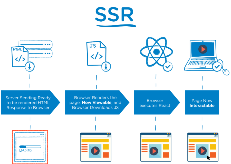 전통적인 웹 애플리케이션의 동작 방식이다. 서버상에서 렌더링을 마치고 클라이언트는 이것을 받아서 실행한다. CSR과 달리 페이지를 처음 접속할 때만이 아니라 다른 페이지로 이동할 때마다 새로 고침이 일어난다.