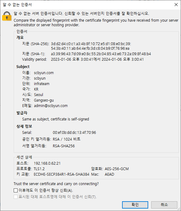 Issuer: C=KR, ST=Seoul, L=Gangseo-gu, O=scbyun, OU=infrateam, CN=scbyun.com/emailAddress=admin@scbyun.com