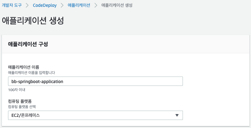 AWS CodeDeploy > 개발자 도구 > CodeDeploy > 애플리케이션 생성