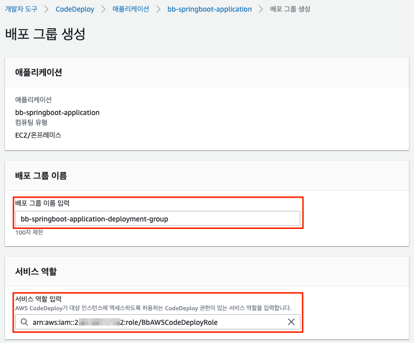 AWS CodeDeploy > 개발자 도구 > CodeDeploy > 애플리케이션 > bb-springboot-application 애플리케이션 > 배포 그룹 생성