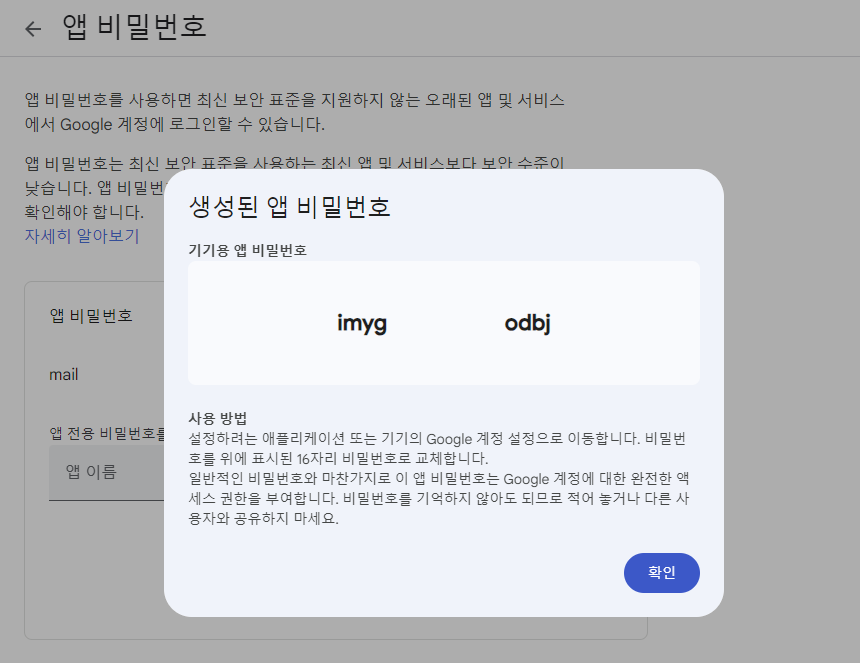 - 참고 : Gmail은 보안상의 이유로 일반 비밀번호 대신 앱 비밀번호를 요구합니다. Gmail 계정에서 2단계 인증을 활성화하고 앱 비밀번호를 생성해야 합니다.Google 앱 비밀번호 생성 가이드에서 생성할 수 있습니다.