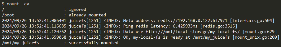 $ nohup juicefs mount redis://192.168.0.122:6379/1 /mnt/my_juicefs > /var/log/juicefs/juicefs.log 2>&1 &