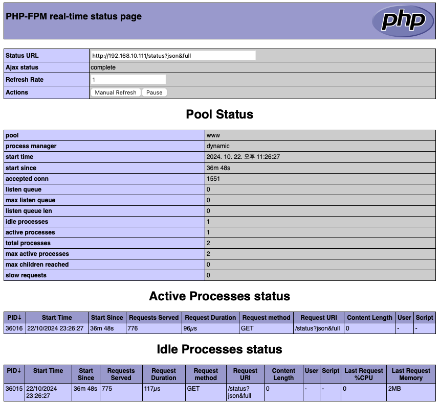 PHP-FPM의 real-time status 페이지 기능이 활성화되었습니다. 상태 페이지에는 현재 PHP-FPM의 프로세스 및 요청 처리 상태에 대한 정보가 표시됩니다.