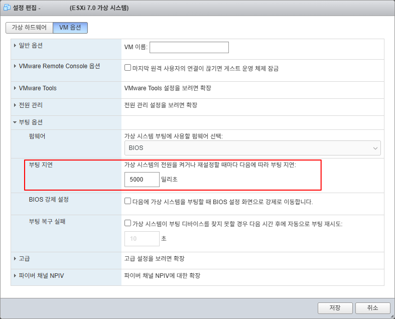 ESXi → VM 편집 → VM Options 탭