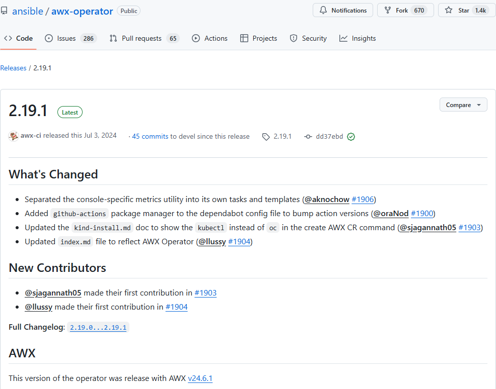 AWX Operator의 GitHub 저장소에서 릴리스 버전과 클론한 로컬 버전이 최신인지 확인하는 방법입니다.