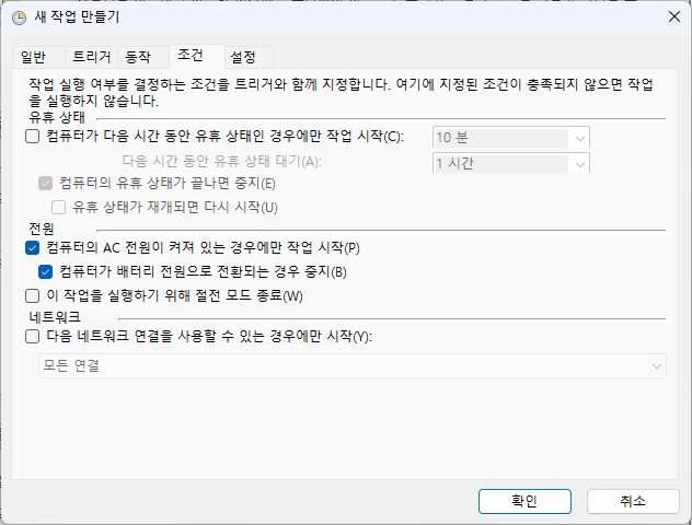 - 트리거: 로그온 시 또는 시스템 시작 시