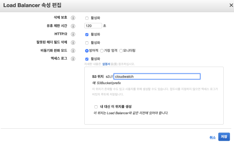 - IAM 역할을 만든 후에 로드 밸런서에서 로그를 저장할 S3 버킷과 IAM 역할을 구성합니다.